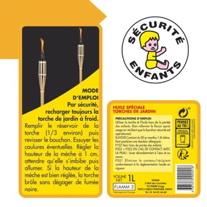 - Conseil d'utilisationUtiliser toujours sous surveillance à l’extérieur et en l’absence de vent. Les torches doivent être installées à distance des matériaux facilement inflammables et hors de la portée des enfants. SECURITE - Recharger toujours la torche de jardin à froid. Ne jamais remplir le réservoir avec de l’alcool de l’essence du white spirit ou du mélange 2 temps. Enfoncer solidement la torche de jardin dans le sol afin qu’elle soit bien stable. Enlever le bouchon du réservoir et remplir celui-ci avec l’huile pour torche (environ 1/3 du réservoir). Replacer le bouchon et dans le cas où de l’huile aurait coulé sur le réservoir l’essuyer avant d’allumer. Régler la hauteur de la mèche à 1 cm maximum (ainsi la torche pourra brûler sans dégager de fumée noire). Attendre que la mèche s’imbibe d’huile (quelques minutes) puis allumer. BOUCHON SECURITE ENFANTS sur la torche et le flacon d’huile. Bien refermer le flacon d’huile après usage en vérifiant que le bouchon sécurité est opérationnel.
