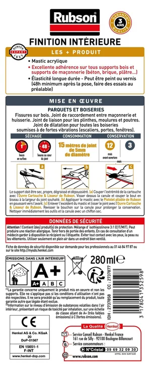- Usage du produit• Fissures sur bois. • Joints de raccordement entre maçonnerie et huisseries. • Joints de liaison pour les plinthes moulures et poutres. • Joints de dilatation pour toutes les boiseries soumises à de fortes vibrations (escaliers portes fenêtres...).