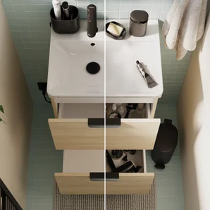 Meuble assez beau surtout pour le prix. Dommage il y a un blocage sur la poignée du haut, celle ci est trop serré à la vasque et cela empêche la fermeture correct. Cela se joue à 2/3mm . Je vais donc devoir mettre d'autres poignées au milieu du tiroir, cela fait donc un investissement supplémentaire, dommage....