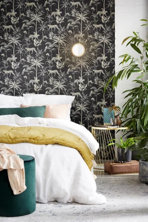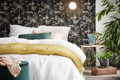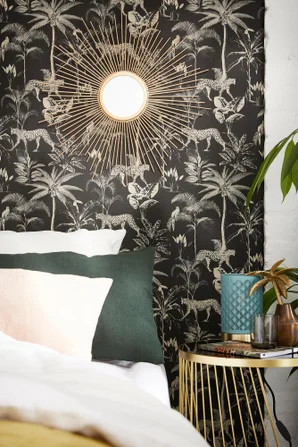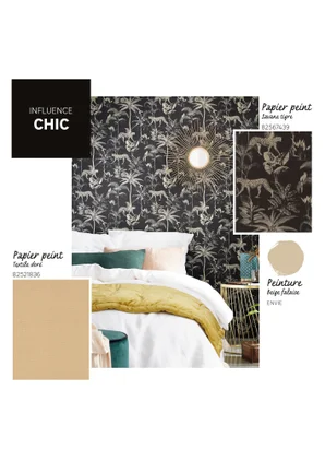 Notre chambre est métamorphosée grâce au papier. Pour éviter un effet "étouffant", nous avons peint 2 murs en beige silt. Très satisfaits !