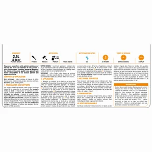 - Pouvoir couvrant (en m² par L) selon la norme ISO 6504-13 couvrant moyen 2 couches selon support