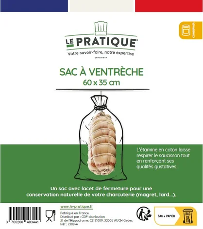 Sac à ventrèche - Le PratiqueUn sac avec lacet de fermeture pour une conservation naturelle de votre charcuterieDescription :Le sac à ventrèche Le Pratique permet de conserver votre ventrèche de manière optimale et naturelle. L'étamine en coton laisse respirer la charcuterie (magret, lard, ventrèche…) tout en renforçant ses qualités gustatives.Fabriqué en FranceCaractéristiques :Dimensions : 60 x 35 cmMatière : coton